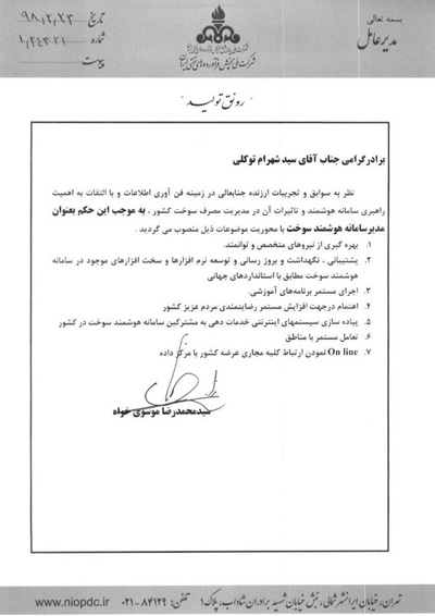 سیدمحمدرضا موسویخواه در این حکم بر پیادهسازی سیستمهای اینترنتی خدماتدهی به مشترکان، آنلاینکردن همه مجاری عرضه سوخت کشور با مرکز داده، پشتیبانی، نگهداشت، روزآمد کردن و توسعه نرمافزارها و سختافزارهای سامانه هوشمند سوخت و همکاری مستمر با مناطق تاکید کرده است.