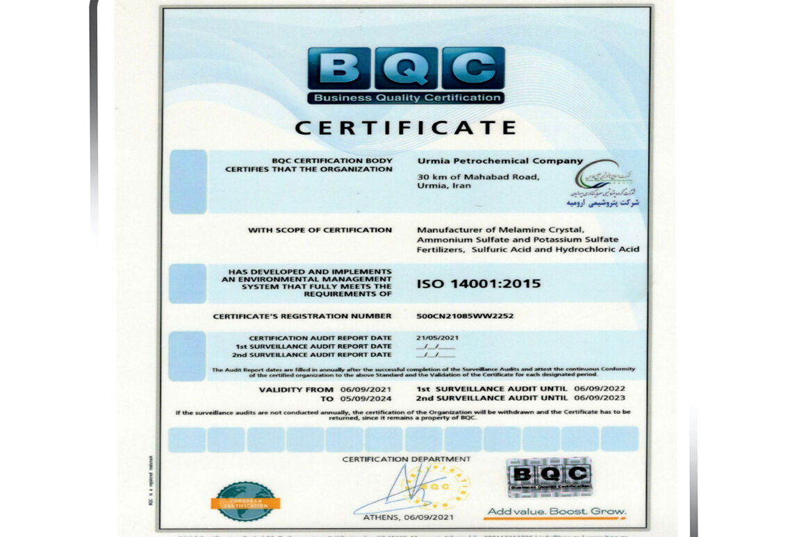با توجه به یکپارچگی سیستمهای مدیریتی در مجتمع پتروشیمی ارومیه، گواهینامه بینالمللی سیستم یکپارچه مدیریت (IMS) از سوی شرکت BQC (یونان) به این شرکت اعطا شد.