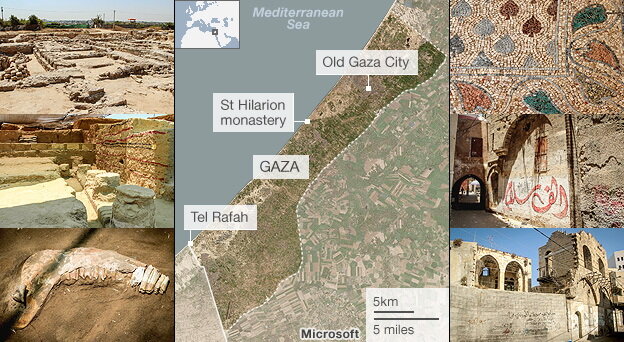 هیام البتر ـ باستانشناس وزارت گردشگری و آثار باستانی غزه ـ در مصاحبهای که سالها پیش در بیبیسی منتشر شده، گفته بود: «در زیر غزه یک غزۀ دیگر وجود دارد، هرچند اینجا مکانها و آثار باستانی تصادفی پیدا میشوند. مثلا زمانی که کارگران مشغول حفاری برای ساختن خیابان صلاحالدین بودند، کلیسای بیزانسی را پیدا کردیم و به طور تصادفی با یک موزاییک زیبا مواجه شدیم.»