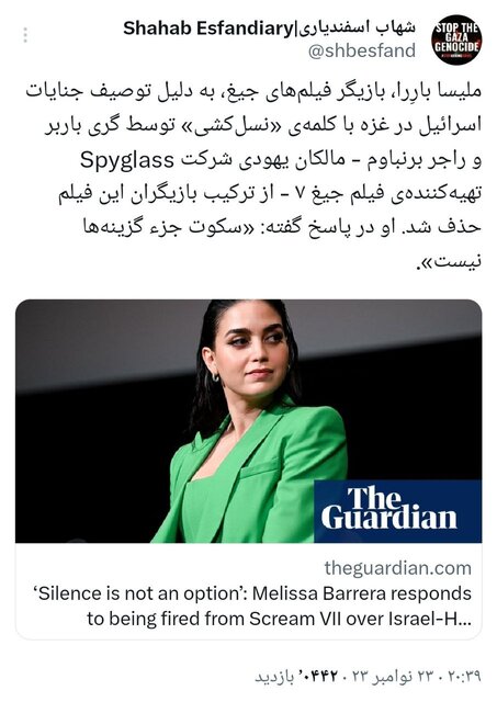 یک فعال رسانه‌ای در توئیتی در واکنش به اخراج بازیگر فیلم جیغ به خاطر محکومیت نسل کشی رژیم صهیونیستی نوشت: سکوت جزو گزینه‌ها نیست!