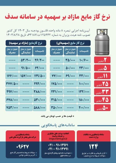 به موجب آییننامه اجرایی تبصره هشت ماده واحده قانون بودجه سال ۱۴۰۳ کل کشور، تصویب نامه هیات وزیران به تاریخ ۲۸ آبان ماه ۱۴۰۳ در سراسر کشور، قیمت گازمایع مازاد بر سهمیه در سامانه به قیمتهای مندرج در جدول در اختیار مصرفکنندگان قرار خواهد گرفت.